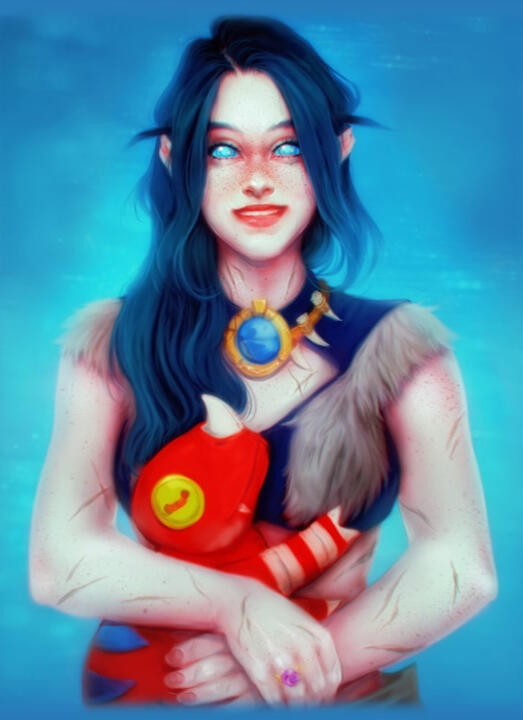 My first ever art piece of El! Here she is holding her first gift, a Plushie Raptor, given to her by Xaradyth Moore at the Suramar Petting Zoo. (Artist: Takacukasa- https://artistsnclients . com/people/takacukasa)